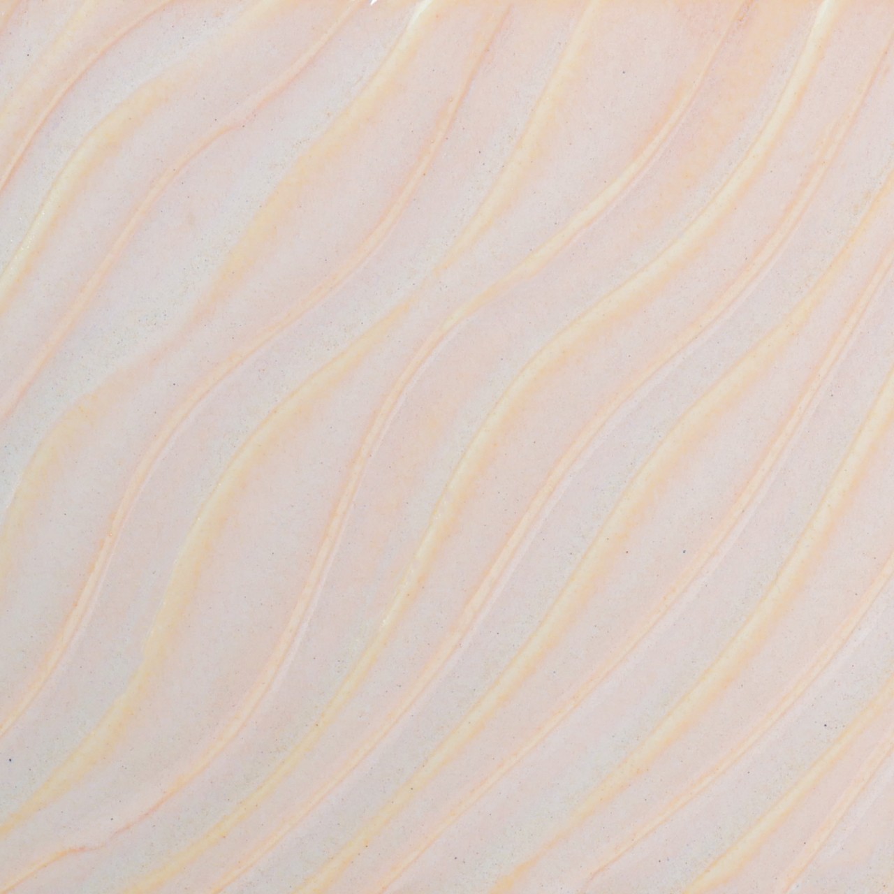 A glossy pale pink glaze like a fresh flower. Breaks across textured surfaces and develops a peachy float when thick.