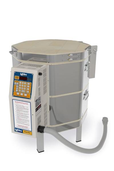 Multi-purpose Kiln Model e18S Easy-Fire Automatic Kiln with with Multi-Program Two-Zoned DynaTrol mounted in an easy-open cool-firing piggy-back control panel that is angled for easy viewing of control. Kiln comes with hard ceramic element holders, protected thermocouples, strong solid-top stand, and solid peephole plugs. 17.5" diameter by 18" high (2.6 cubic feet). 2.5" K23 brick. |